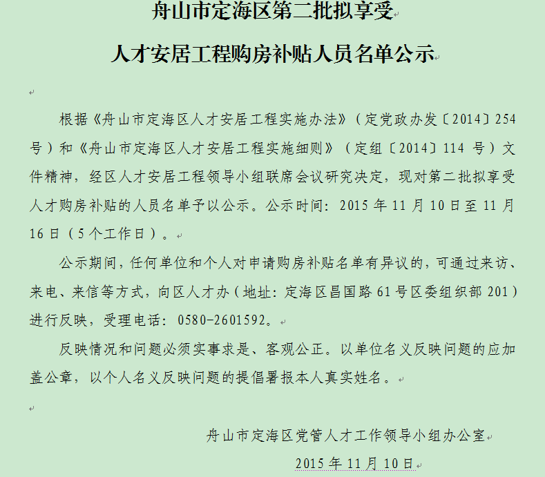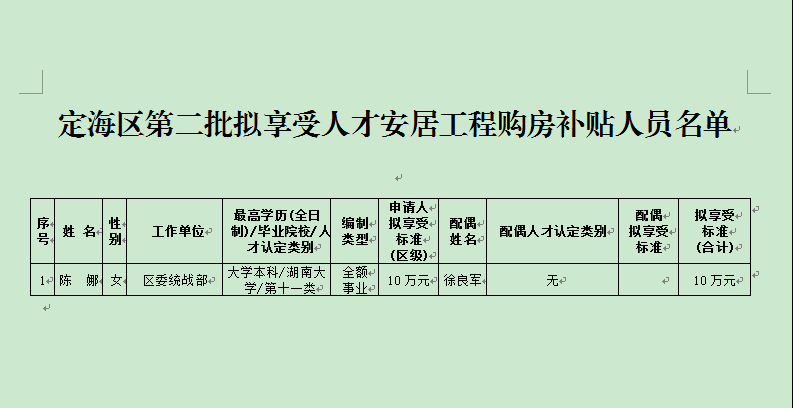 舟山市定海区第二批拟享受人才安居工程购房补贴人员名单公示